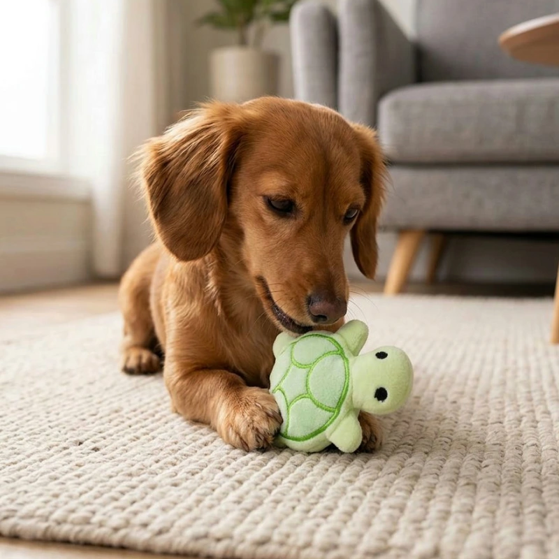 My sister’s dog adores this turtle. It’s soft enough for her tiny jaw, and the playful squeak keeps her busy while we cook dinner.