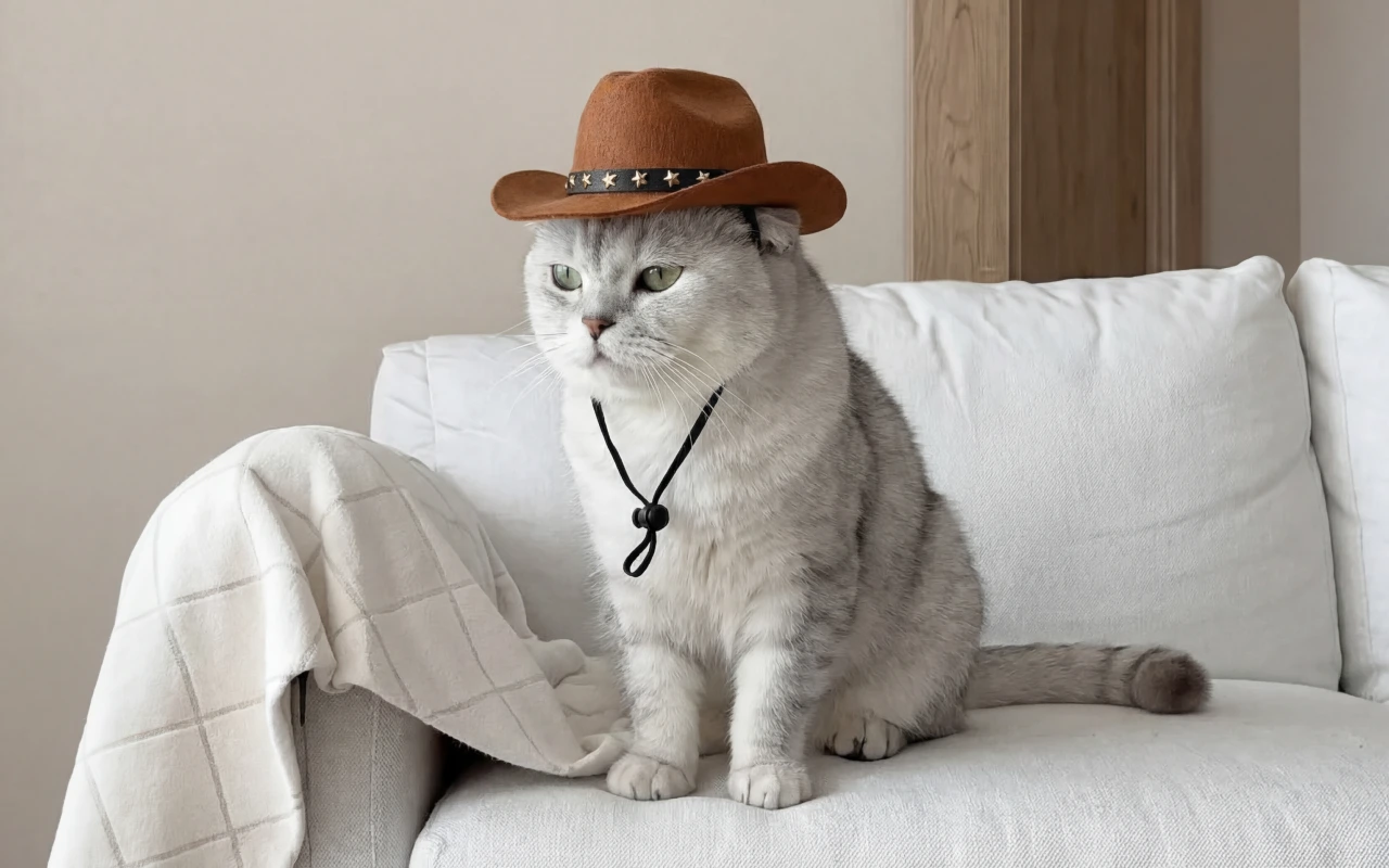 I ordered the hat for my cat as a joke, but it turned into a daily thing. She lounges on the sofa in it and looks like a tiny sheriff.