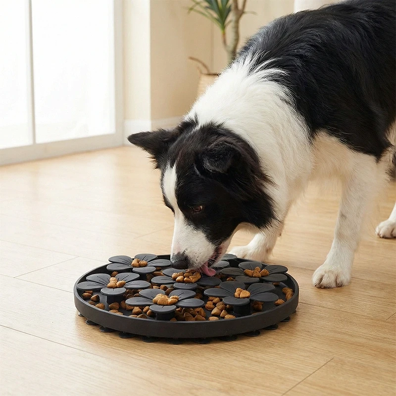 Our pup used to tip his regular dish every meal but this mat sticks like glue! He spends more time munching which means less gulping and upset belly. I love how bright and fun it looks.