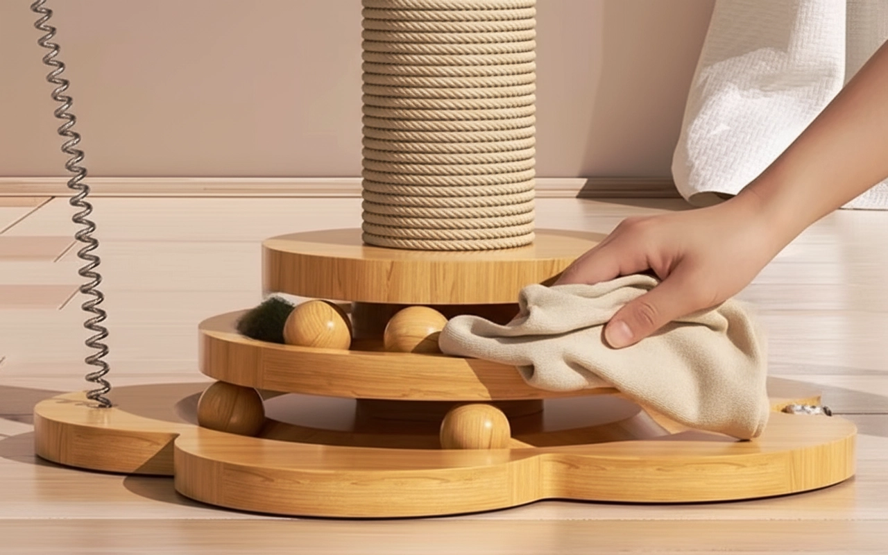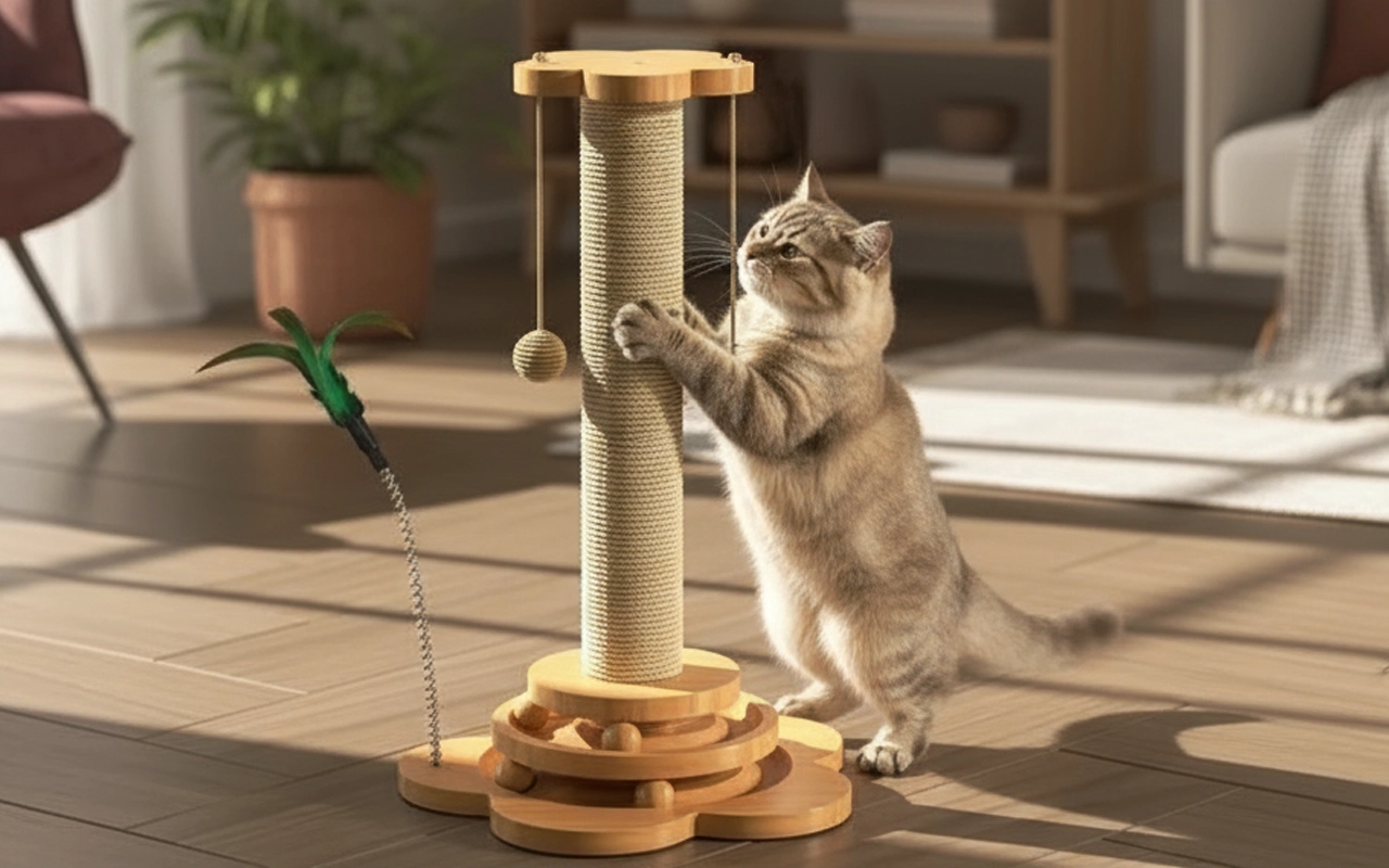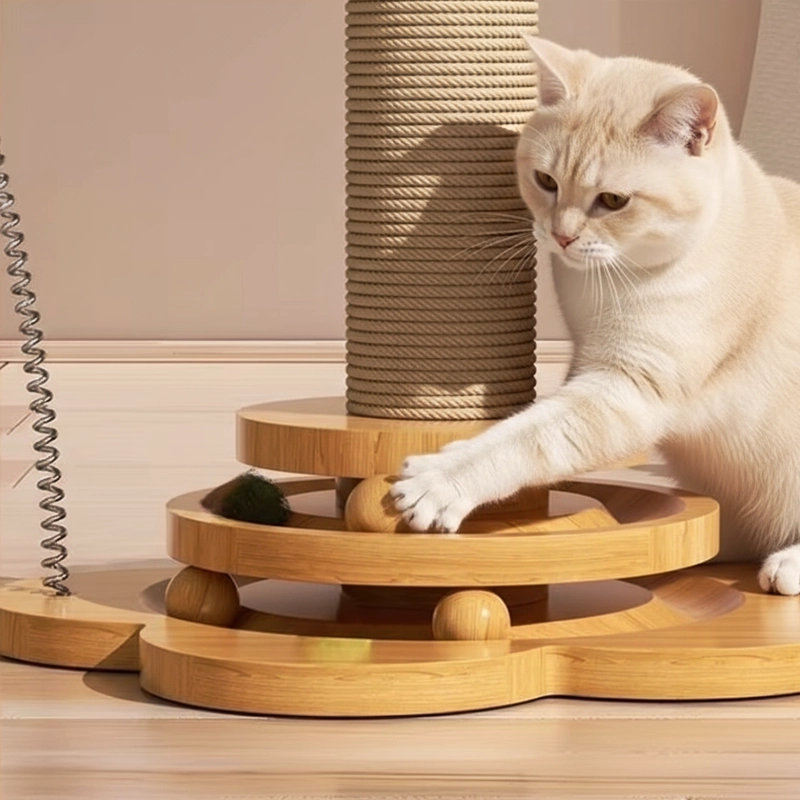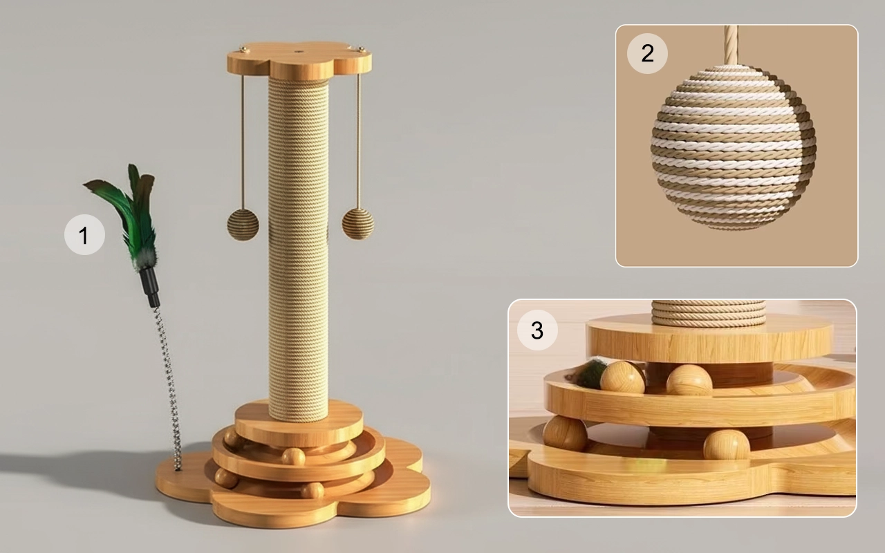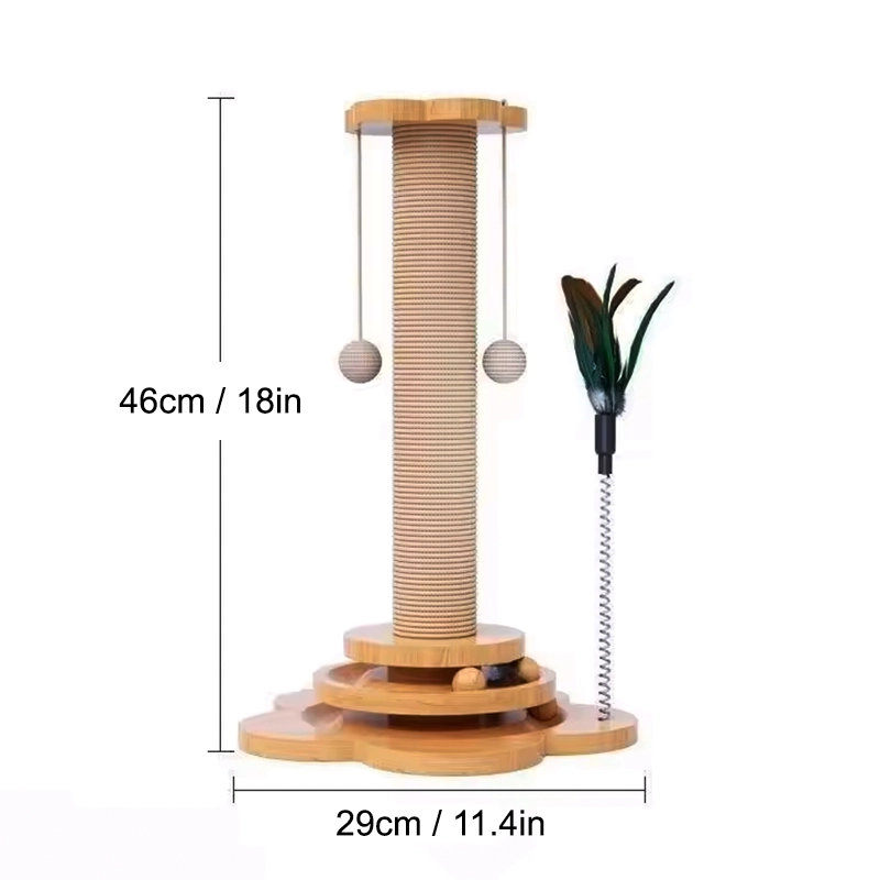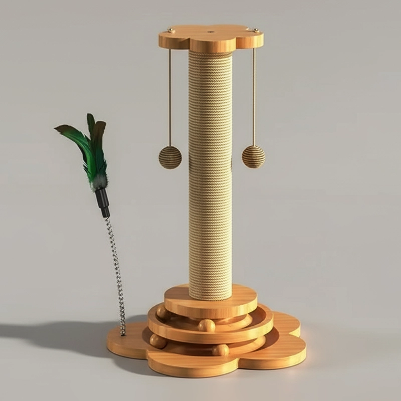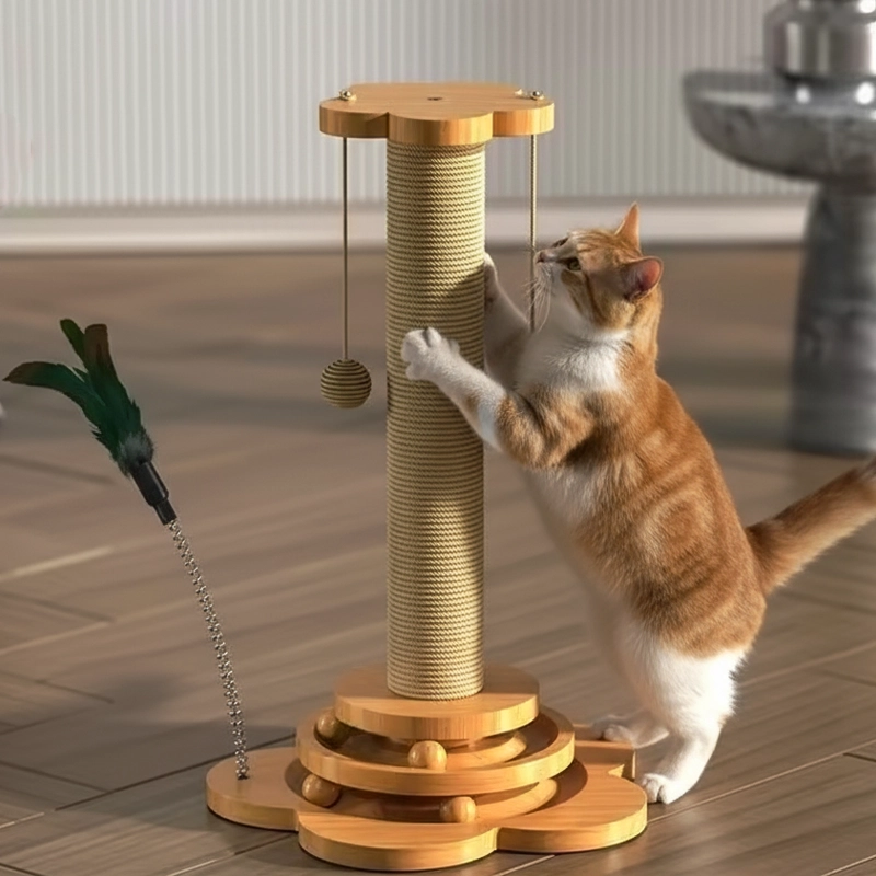 Wooden Cat Sisal Scratching Post with Hanging Balls